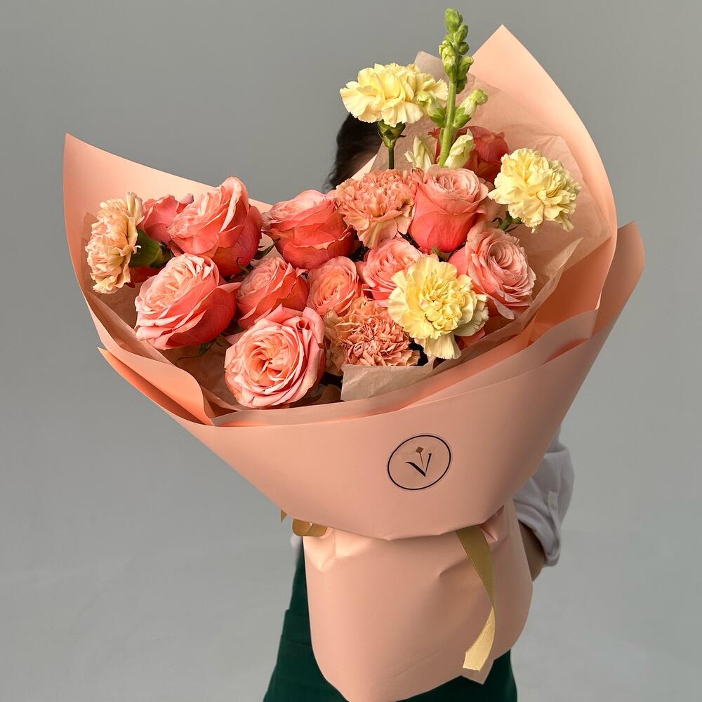 Альстромерии, Гвоздики, Кустовые розы, Лизиантусы, Розы, Хризантемы