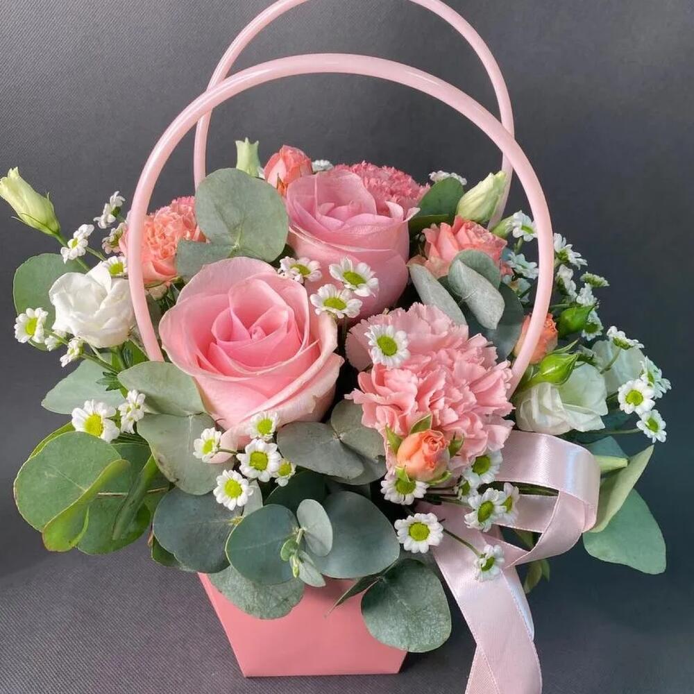 Роза Эквадор – 2 шт.Роза кустовая – 1 шт.Лизиантус – 1 шт.Сантини – 2 шт.Диантус – 3 шт.Эвкалипт – 3 шт.сумочка картонная с ручками – 1 шт.Губка флористическая – 1 шт.