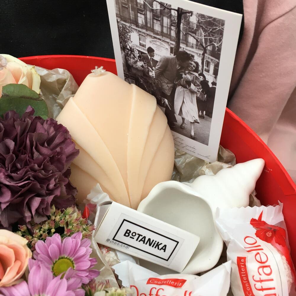 Хризантема Сантини – 1 шт. Кустовая роза – 2 шт. Диантус – 3 шт. Хамелациум – 1 шт. Седум – 3 шт. Открыточка с вашими пожеланиями – 1 шт. Свеча ручной работы – 1 шт. спички для свечей – 1 шт. Конфеты Raffaello – 5 шт. ракушка из гипса – 1 шт. Коробка подарочная – 1 шт.
