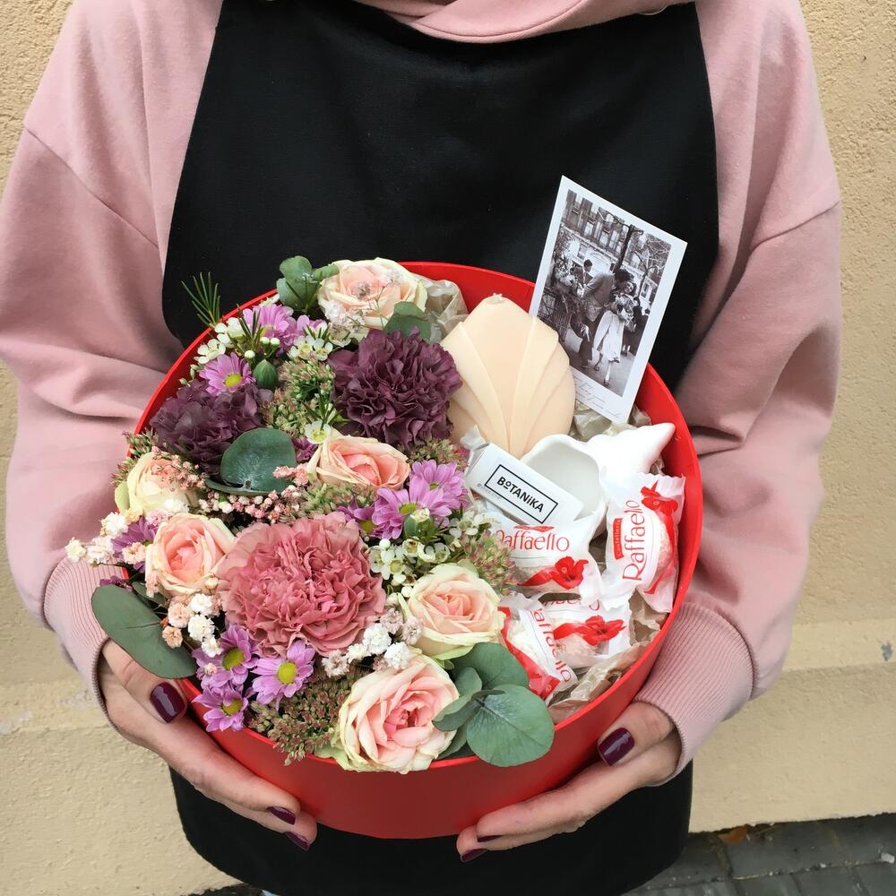 Оригинальный микс из цветов и подарков в одном боксе!