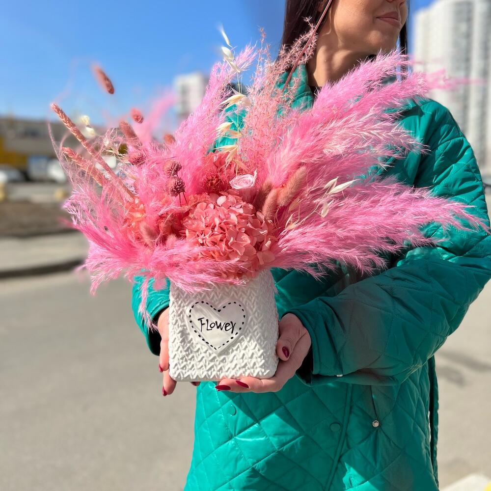 Композиция в керамическом кашпо с гортензией,кортадерией,лагурусом,нигеллой,розой,пшеницей,клевером