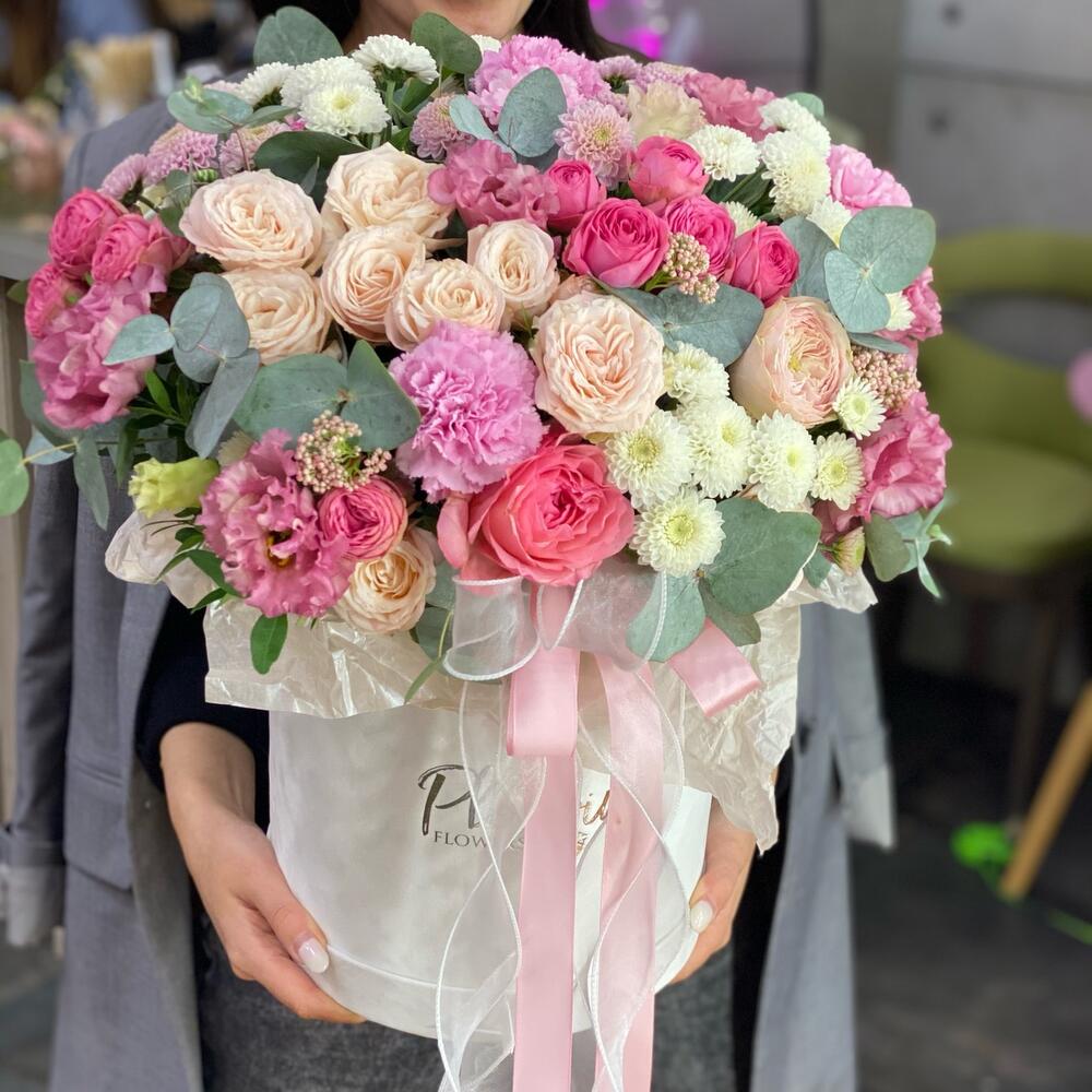 Коробка – 1 шт.Кустовая роза – 5 шт.Хризантема кустовая – 3 шт.Диантус – 5 шт.Роза – 5 шт.Эвкалипт – 3 шт.Оазис флористический – 2 шт.