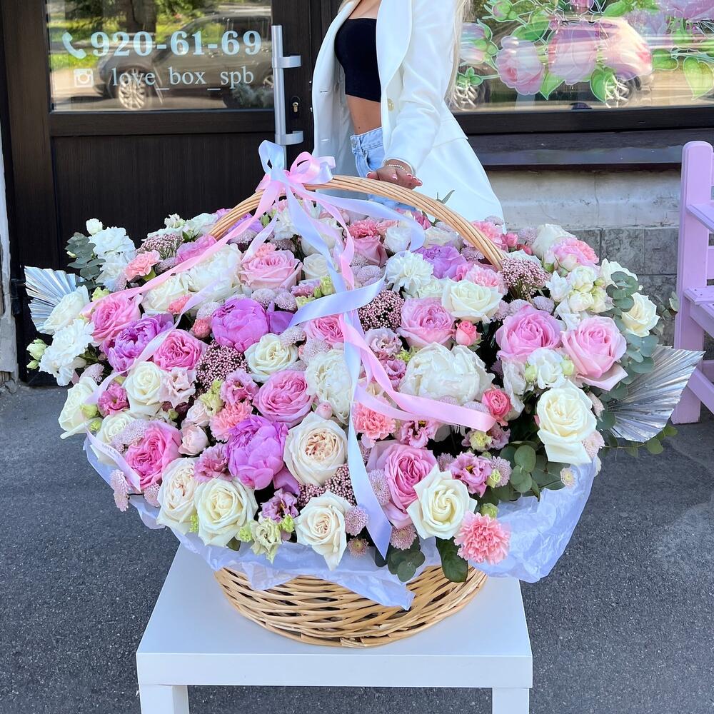 Пион – 10 шт.Пионовидная роза – 15 шт.Роза Эквадор – 25 шт.Хризантема кустовая – 10 шт.Лизиантус – 12 шт.Диантус – 12 шт.зелень декоративная – 11 шт.Корзина плетеная – 1 шт.Дизайнерская упаковка – 5 шт.