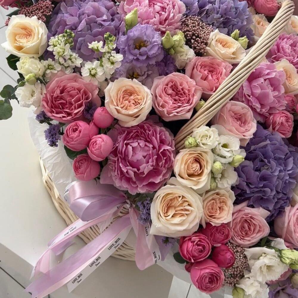 Гортензия – 4 шт.Роза пионовидная – 25 шт.Роза Эквадор – 20 шт.Пион – 10 шт.Роза кустовая – 10 шт.Лизиантус – 15 шт.Статица – 5 шт.Озотамнус – 6 шт.Корзина плетеная – 1 шт.Дизайнерская упаковка – 5 шт.