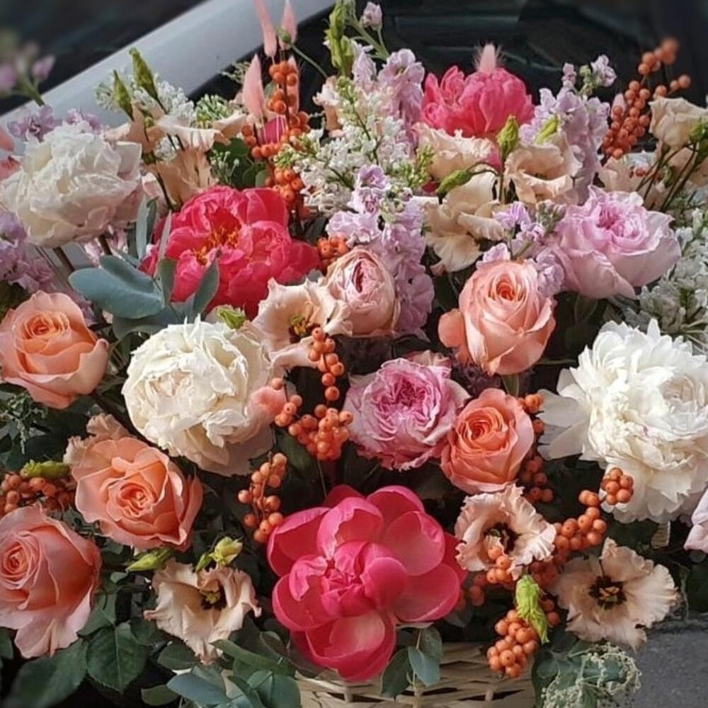 Корзина с пионами,маттиолой и пионовидными розами