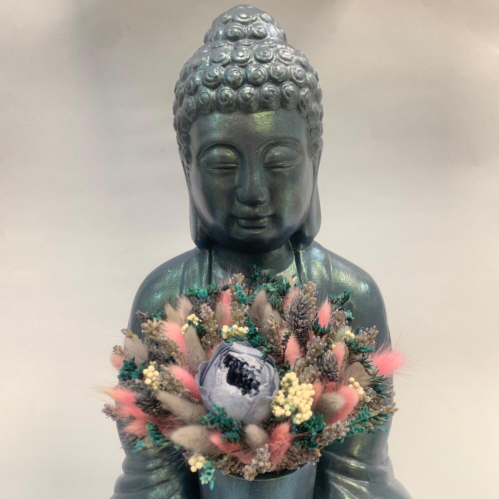 кашпо гипсовое будда – 1 шт.лагурус микс – 50 шт.Роза стабилизированная – 1 шт.Лаванда (сухоцвет) – 40 гр.Озотамнус – 1 шт.Лимониум – 1 шт.
