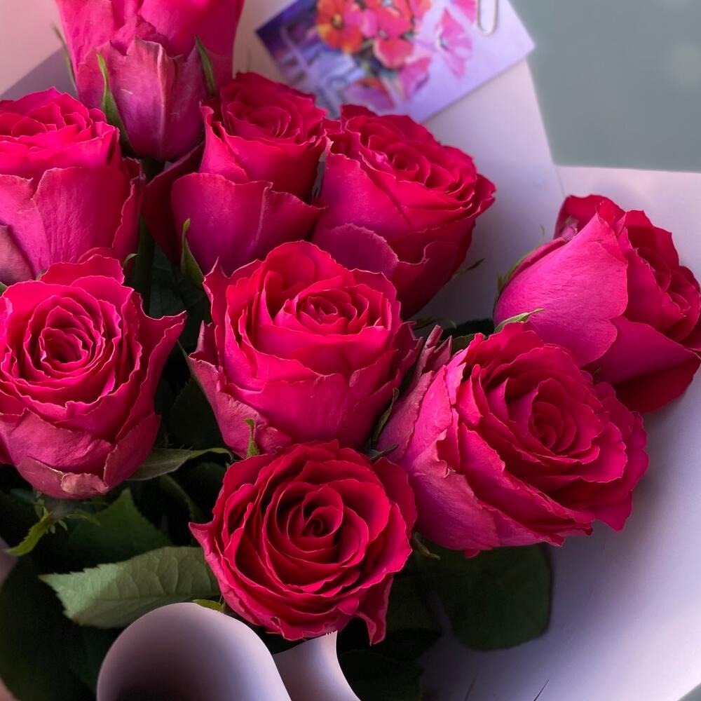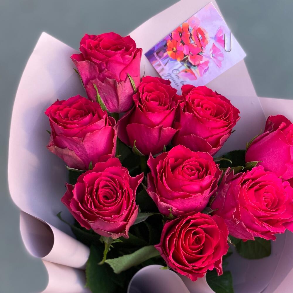 Монобукет роз «Фуксия» с открыткой