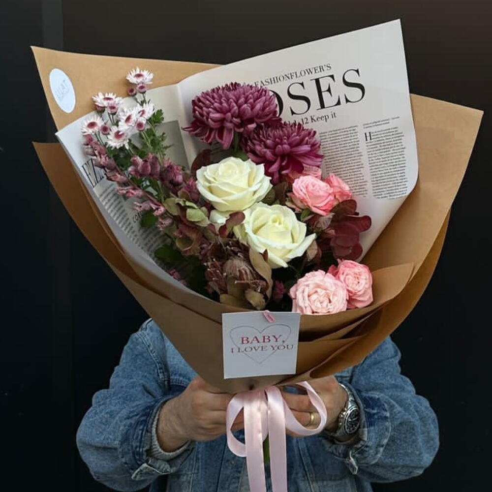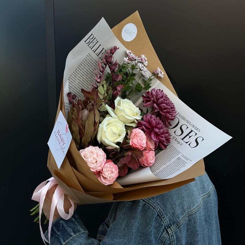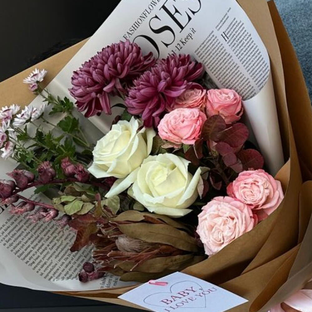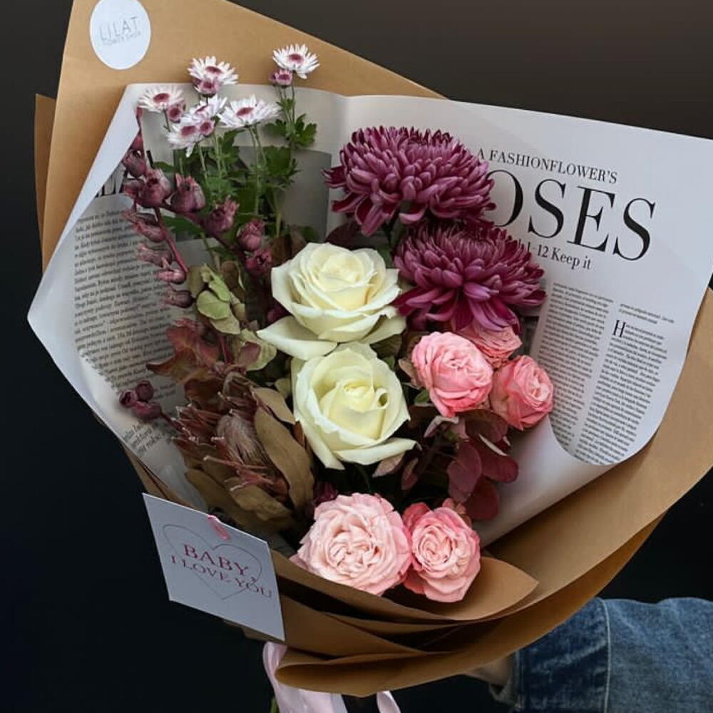 Альстромерии, Гвоздики, Кустовые розы, Лизиантусы, Розы, Хризантемы