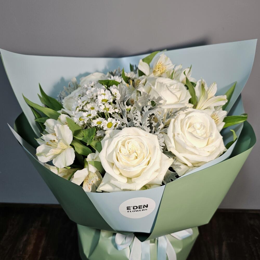 Альстромерии, Кустовые розы, Лизиантусы, Пионовидные розы, Розы, Ромашки