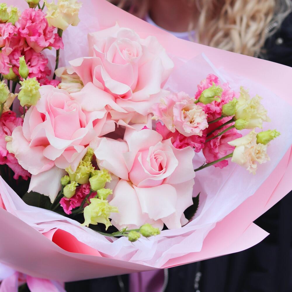 Розовый букет-комплимент с французскими розами и лизиантусом
