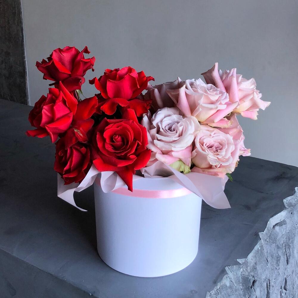 Коробка заполнена цветами со всех сторон, пустых мест нет!Дизайнерская композиция 50/50 из самых крутых сортов роз. Пудровая роза, редкого оттенка Faith и, по-настоящему, АЛАЯ, а не бордовая роза Nina. Каждый бутон раскрыт вручную по специальной технике для большей пышности и «Вау!» эффекта. На стойкость и качество цветка раскрытие никак не влияет.Все наши букеты доставляются в воде и транспортировочной коробке, поэтому можете быть уверены, что каждый цветок доедет в целости и сохранности:)Не храните букет возле отопительных приборов и под прямыми солнечными лучами! Раз в два дня в губку можно подливать пол стакана воды.