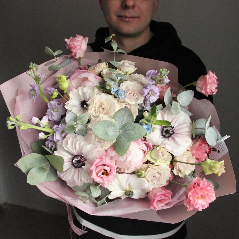 Авторский нежный букет с анемонами, пионами, твидией, матиоллой, лизиантусом и ароматным эвкалиптом, в локаничной упаковке.Стильное цветочное решение для любого случая .