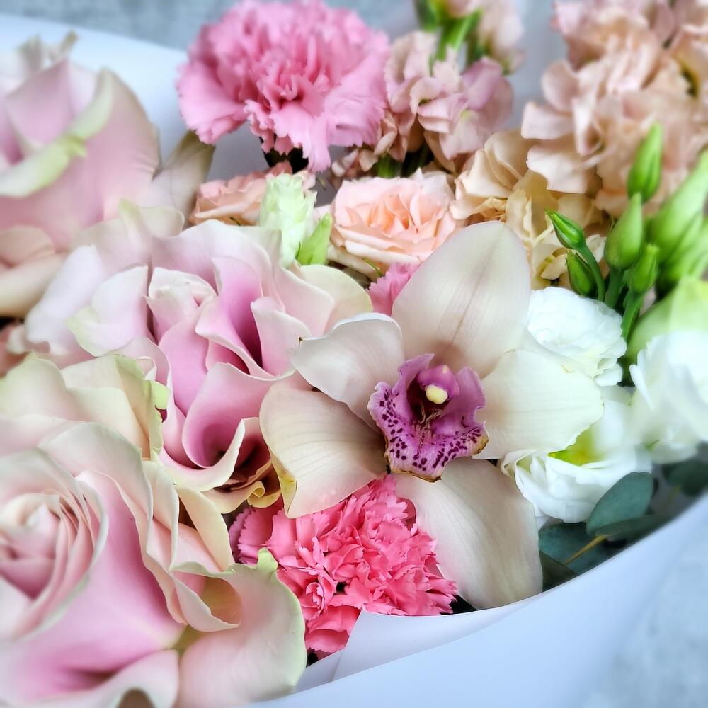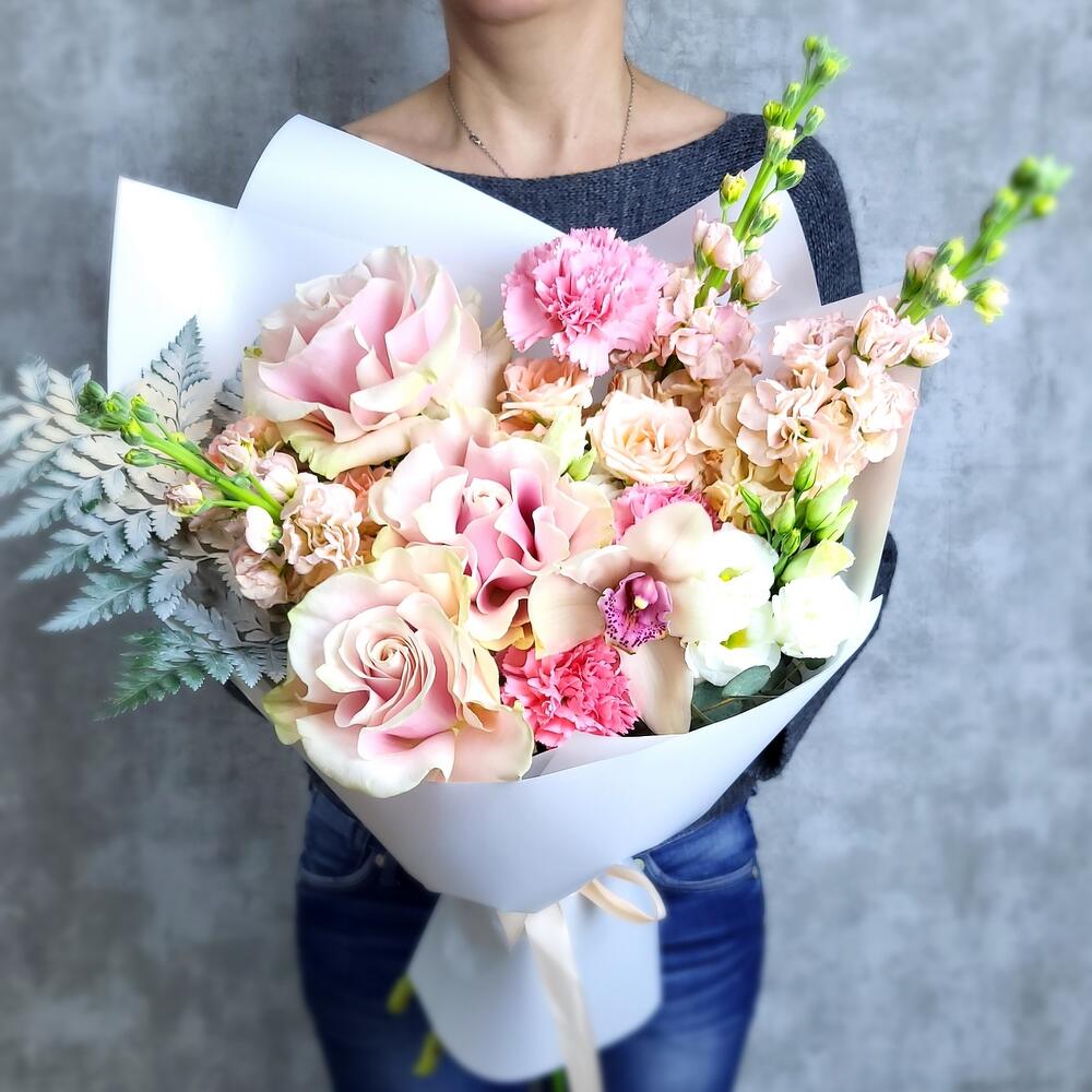 Гвоздики, Лизиантусы, Розы, Тюльпаны