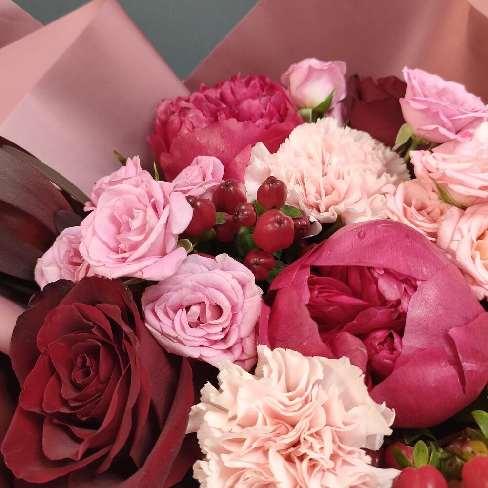Гвоздики, Лизиантусы, Розы, Тюльпаны