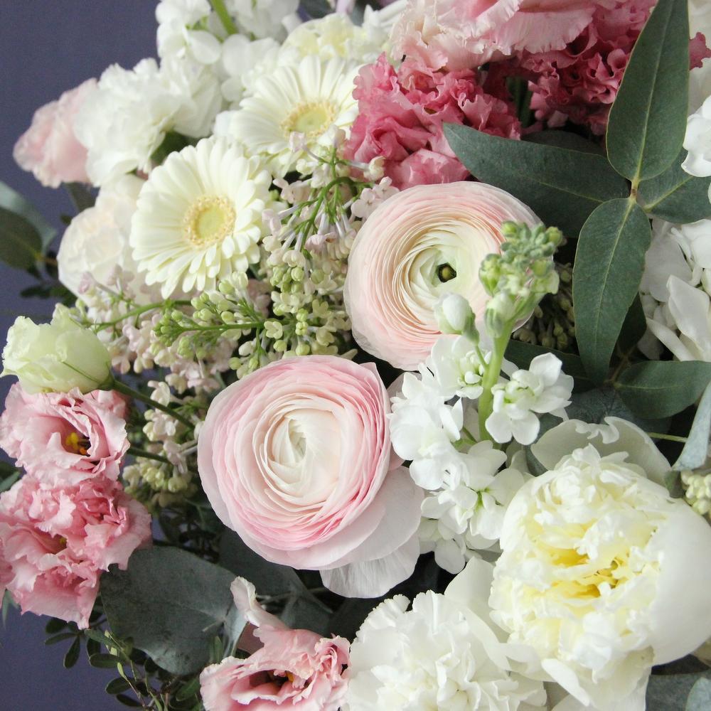 Пион – 5 шт.Роза пионовидная – 9 шт.Гербера – 7 шт.Диантус – 10 шт.Маттиола белая – 5 шт.Лизиантус – 7 шт.Эвкалипт – 11 шт.Ранункулюс – 7 шт.Сирень – 5 шт.Корзина – 1 шт.