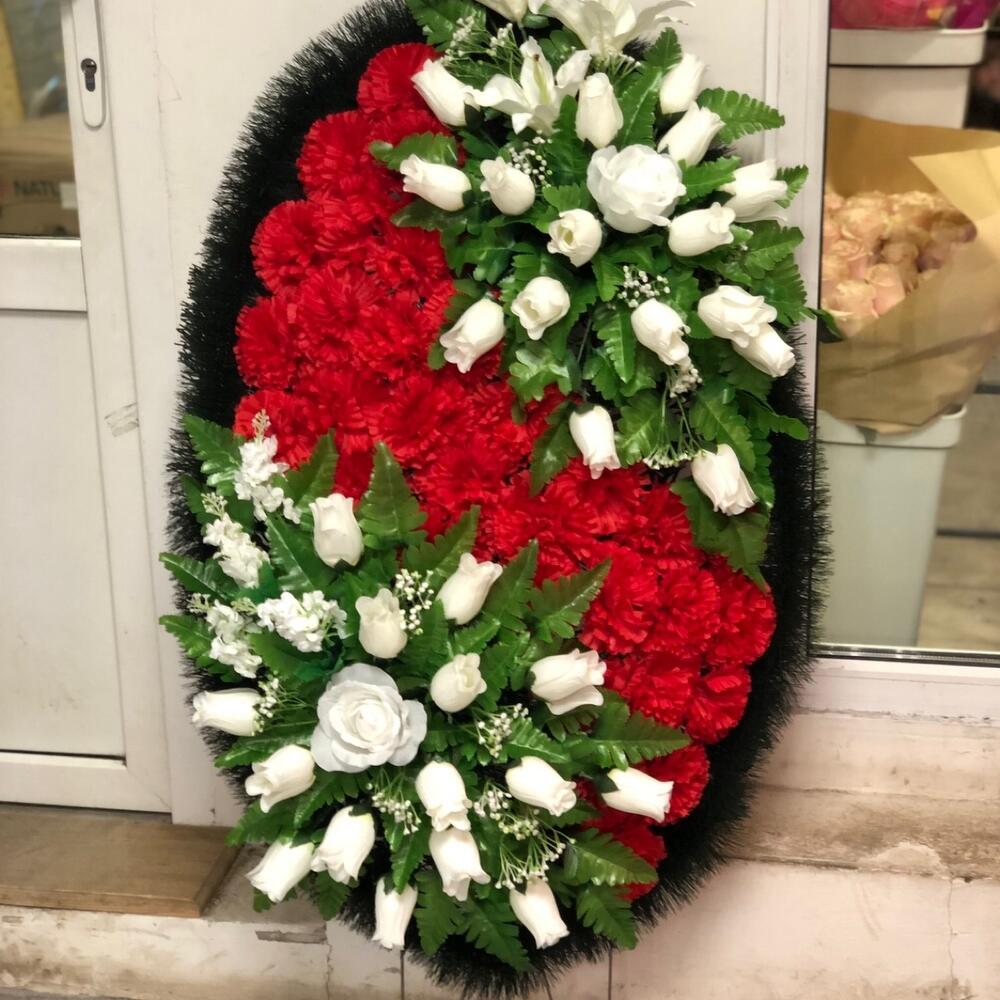 Венок – 1 шт.Роза – 32 шт.Лилия – 3 шт.Гвоздика – 30 шт.зелень декоративная – 15 шт.